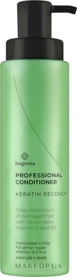 Професійний кондиціонер для волосся «Кератинове відновлення» від бренда Bogenia — це ефективний засіб із дієвою формулою, наповненою активами. Продукт містить гідролізований кератин, вітаміни Е та В5. В синергії вони живлять та відновлюють структуру волосся, повертають йому еластичність і здоровий вигляд. Кондиціонер Keratin Recovery створено без парабенів та фталатів. М’який склад робить його більш натуральним і безпечним для використання.